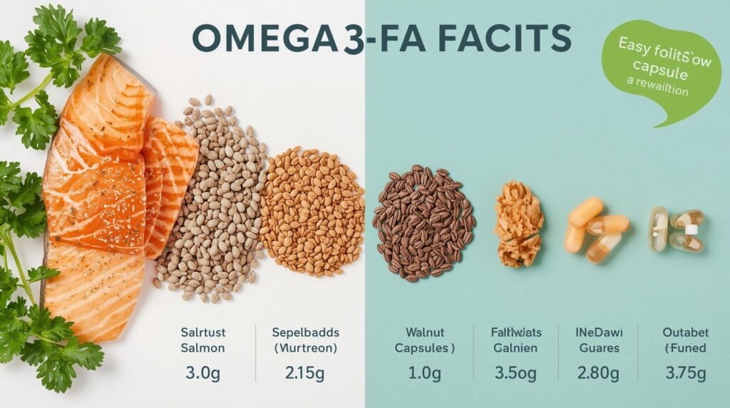 Infográfico mostrando diferentes porções de alimentos ricos em omega 3 e suas quantidades equivalentes em cápsulas.